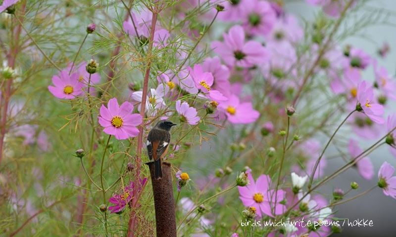 コスモスが咲く時期に渡るノビタキがとまるから